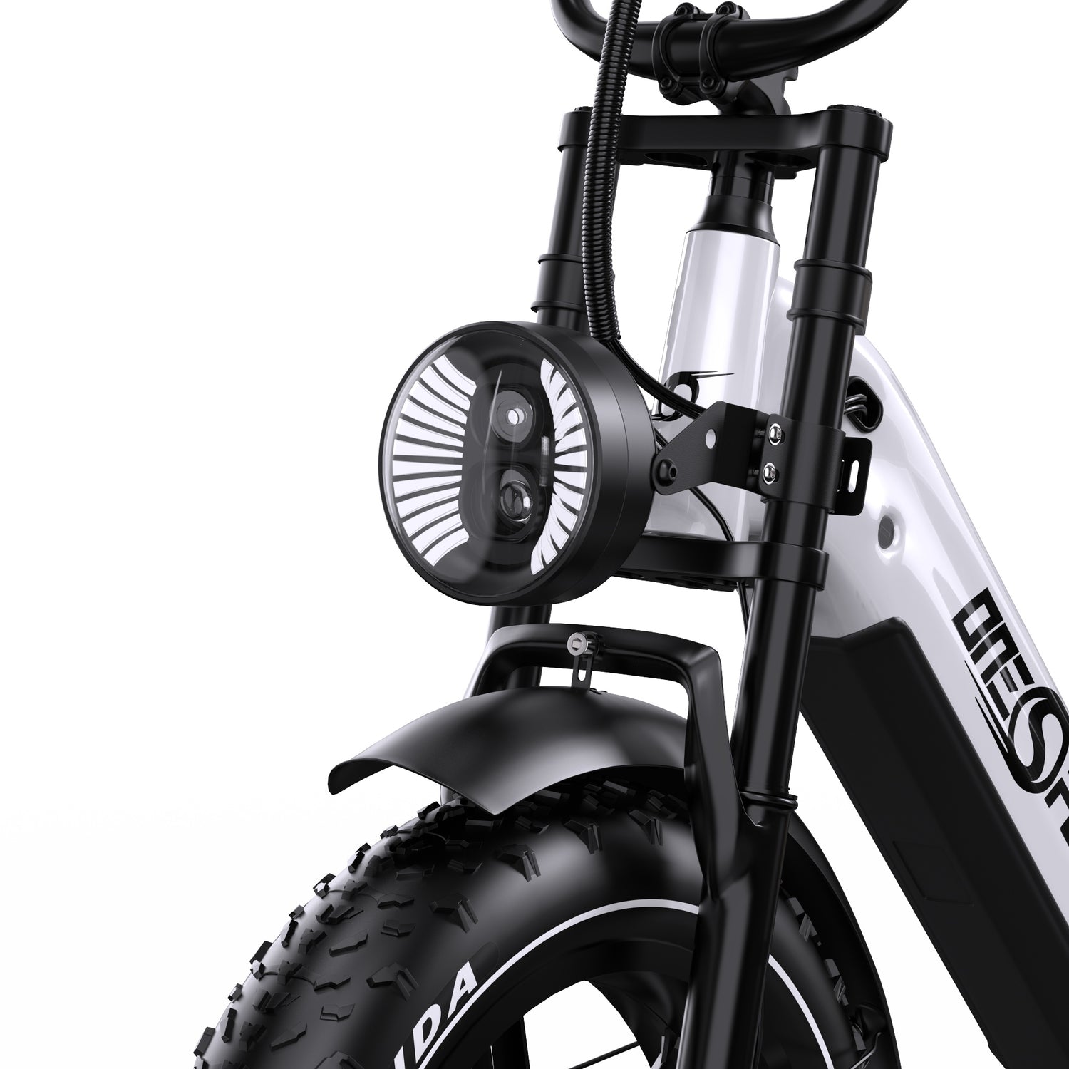 Das OT08Pro Fatbike verfügt über eine Doppelkrallen-Federungsgabel, die für hervorragende Stoßdämpfung, mehr Stabilität und präzise Kontrolle sorgt – für eine sanfte Fahrt auf jedem Untergrund.