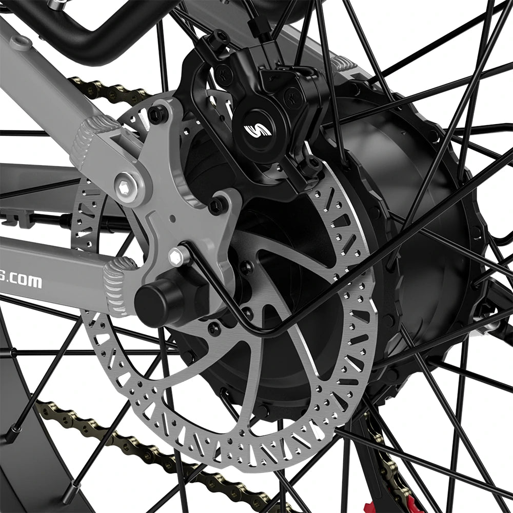 Doppelte hydraulische Bremsen bieten hervorragende Bremsleistung und Kontrolle für das Shengmilo S600 2000W Elektrofahrrad. Mit sanfter Modulation und präziser Bremskraft vermitteln diese Bremsen dem Fahrer Vertrauen. Sie bieten eine gleichbleibende Leistung für Sicherheit unter schwierigen Bedingungen. Sie sind einfach zu installieren und einzustellen und können aufgerüstet oder ersetzt werden. Insgesamt verbessern hydraulische Bremsen die Bremsleistung, Sicherheit und das Fahrerlebnis für Besitzer eines Shengmilo S600-Elektrofahrrads mit Doppelmotor.